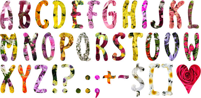 Flowers is a picture display alphabet with capital letters, numbers and some extra characters cut out from photos of fresh flowers displayed at flower stands or seen outdoors. It is a special design for the stock photo market and offered in form of individual images at portals such as shutterstock, depositphotos, and adobe.